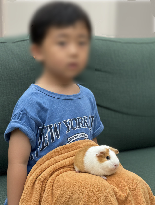 息子は受付を済ませると、タオルを受け取り、ちょこんと座ってモルモットを膝の上に置きました。